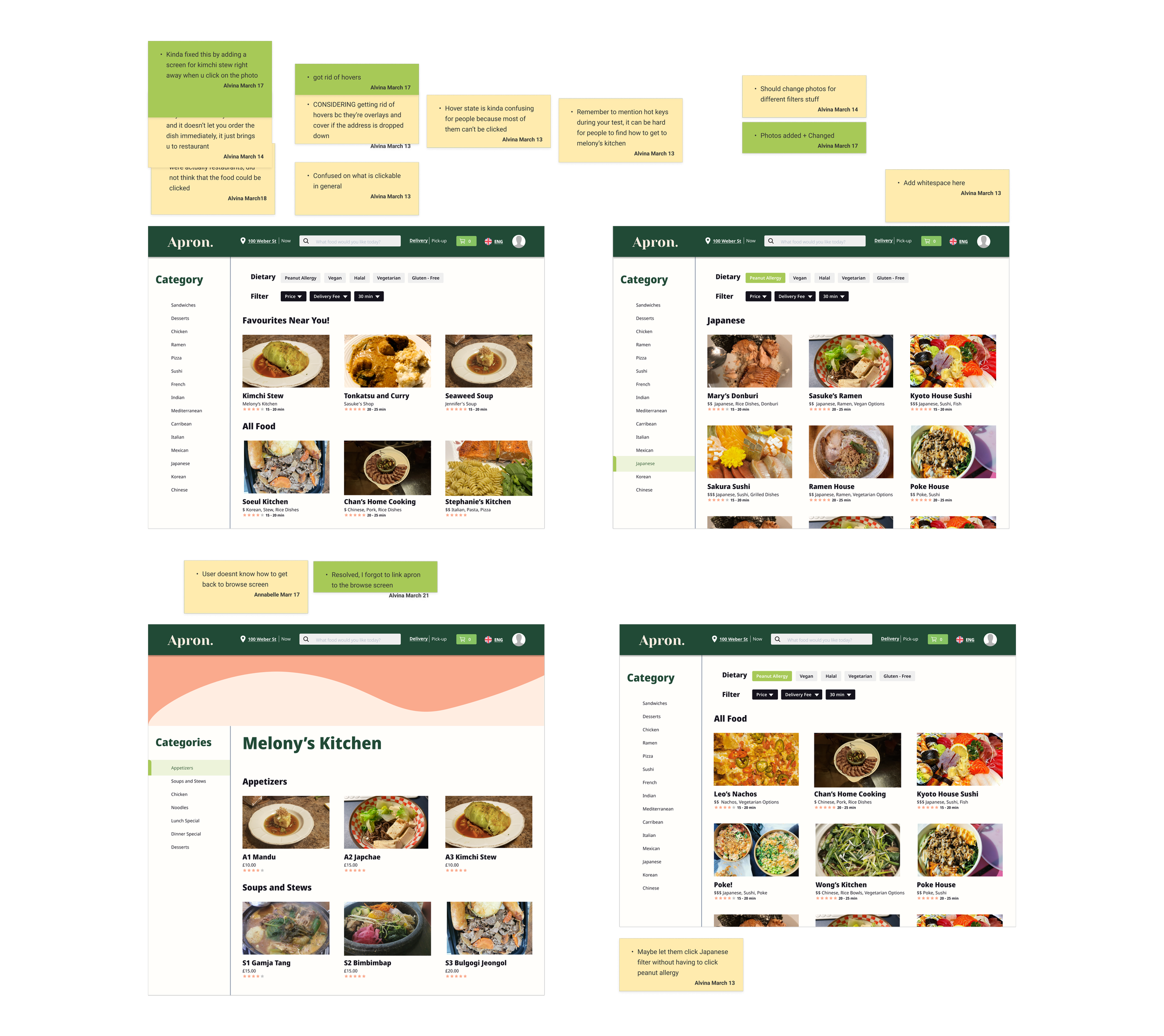 Since publishing our prototypes on user testing websites was not possible, we decided to recruit 5 people per person in the UX sub-team to test our prototype. After conducting tests, I noted the feedback on sticky notes next to each screen and fixed major issues like misaligned navigation bars, bugged overlays. etc.