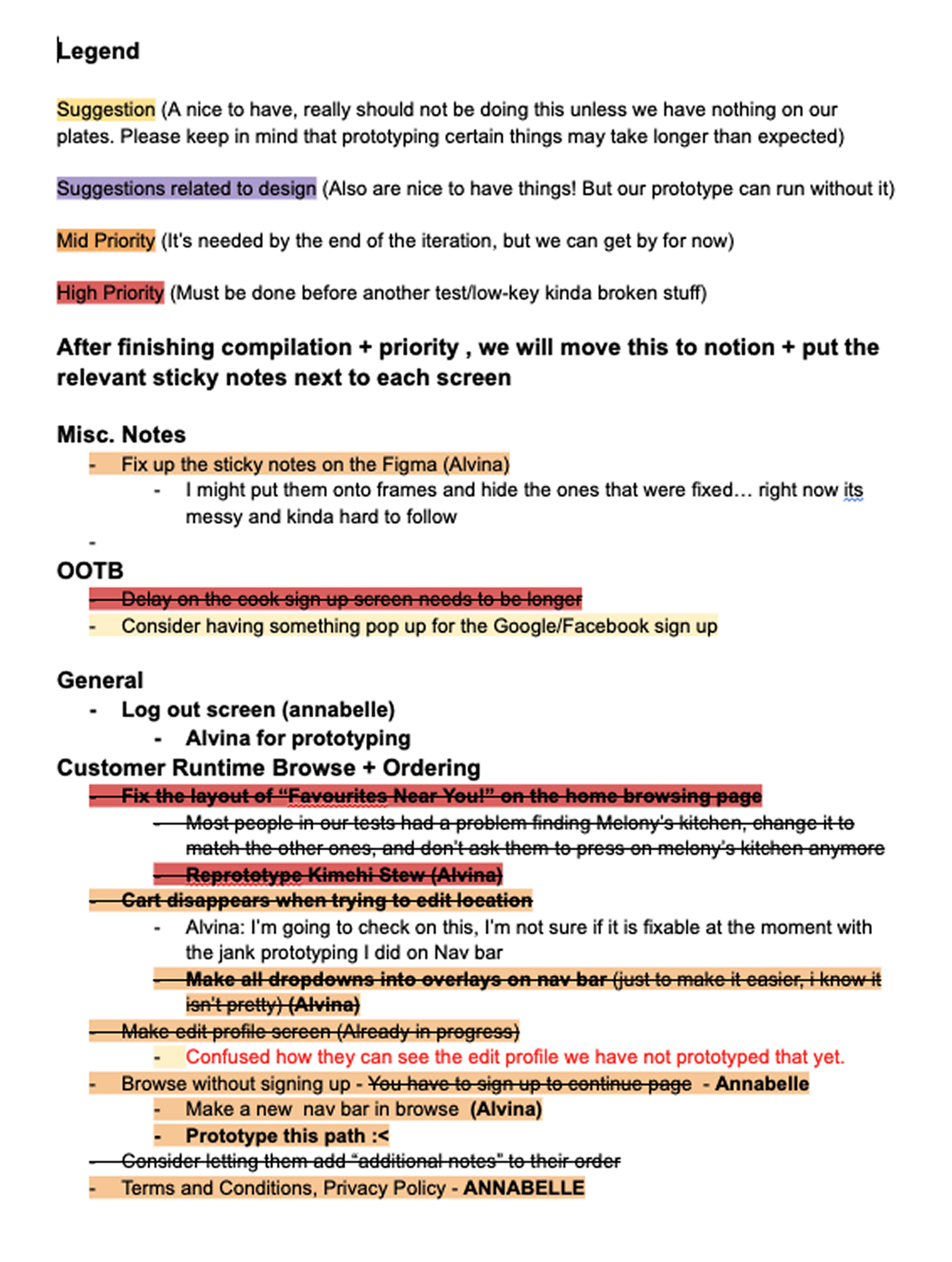After the fix, we planned more think-aloud testing in-person on campus. This test was more standardized, with a task list and notetaker. I compiled the feedback into a document with a priority ranking and delegated the tasks to the sub-team based on their strengths. I focused on all tasks relating to prototyping due to my experience.