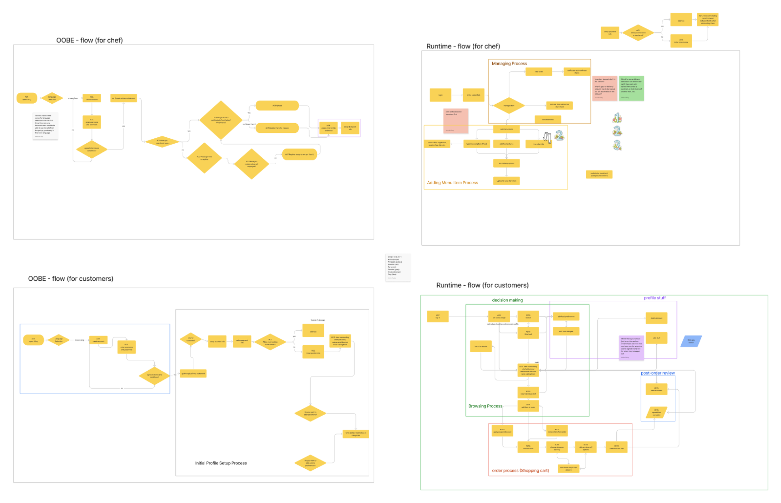 With research and inspiration from competitor websites and food delivery applications, we developed OOTB (Out of the Box) and Runtime flows for both customers and chefs. Each person in the team was assigned to finalize a segment of the flow.