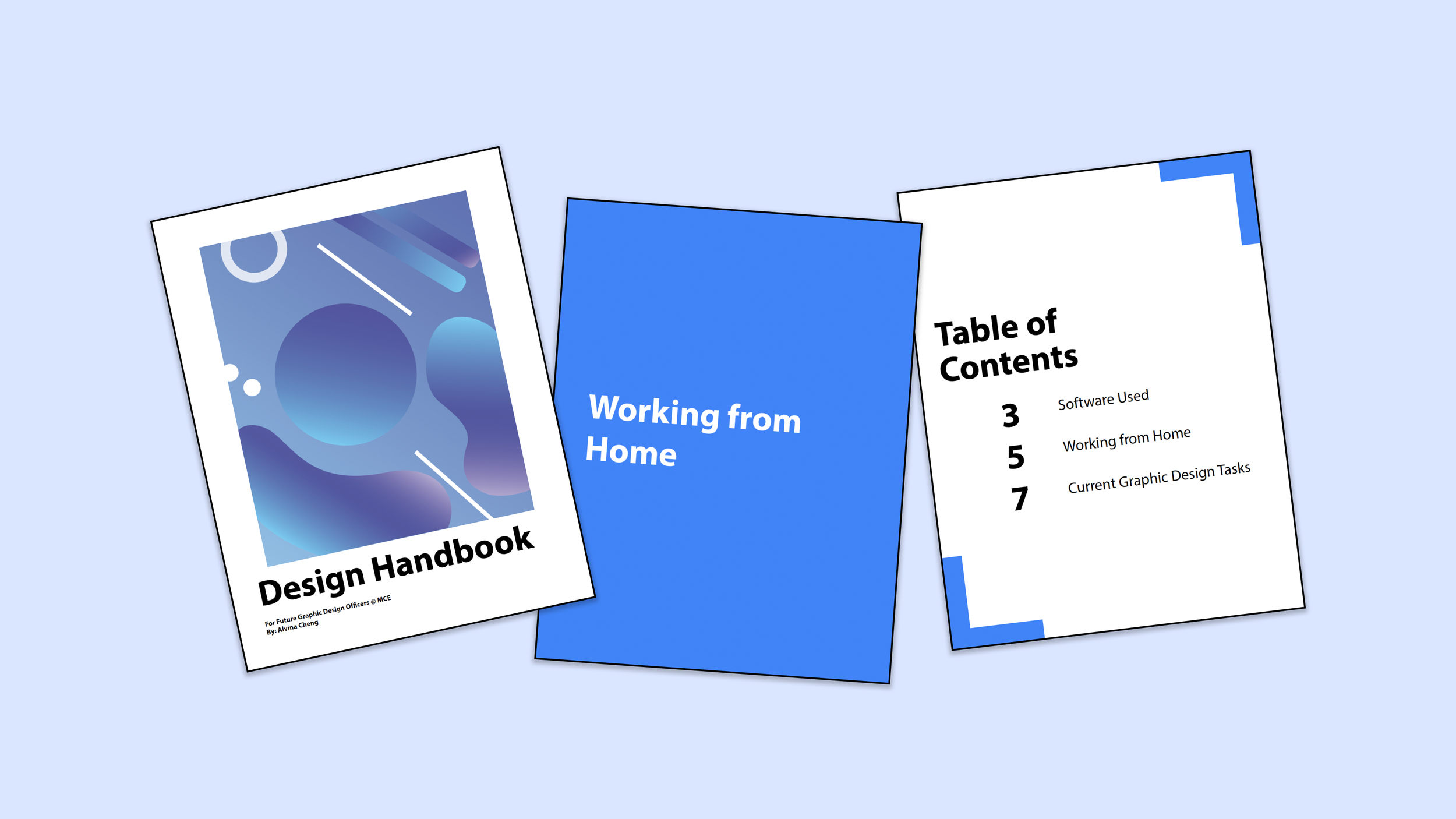 To keep it consistent, the handbook's cover design was made to match the request form that I made. Next, the designs were relatively plain to ensure legibility of the text. Additionally, other designs were added in vibrant colours to captivate the reader's attention.